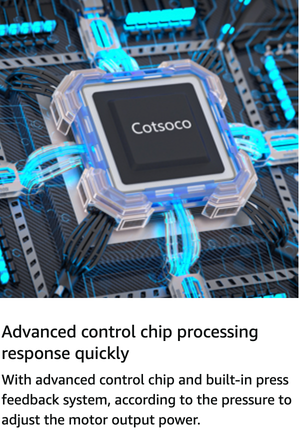 Integrada con un potente motor que permite el rápido y fuerte movimiento de su cabezal, generando una vibración que puede ser aplicada en distintas partes del cuerpo, teniendo diversos beneficios. El motor al detectar presión aumenta la velocidad y fuerza con que actúa, sistema denominado Smart Turbo.